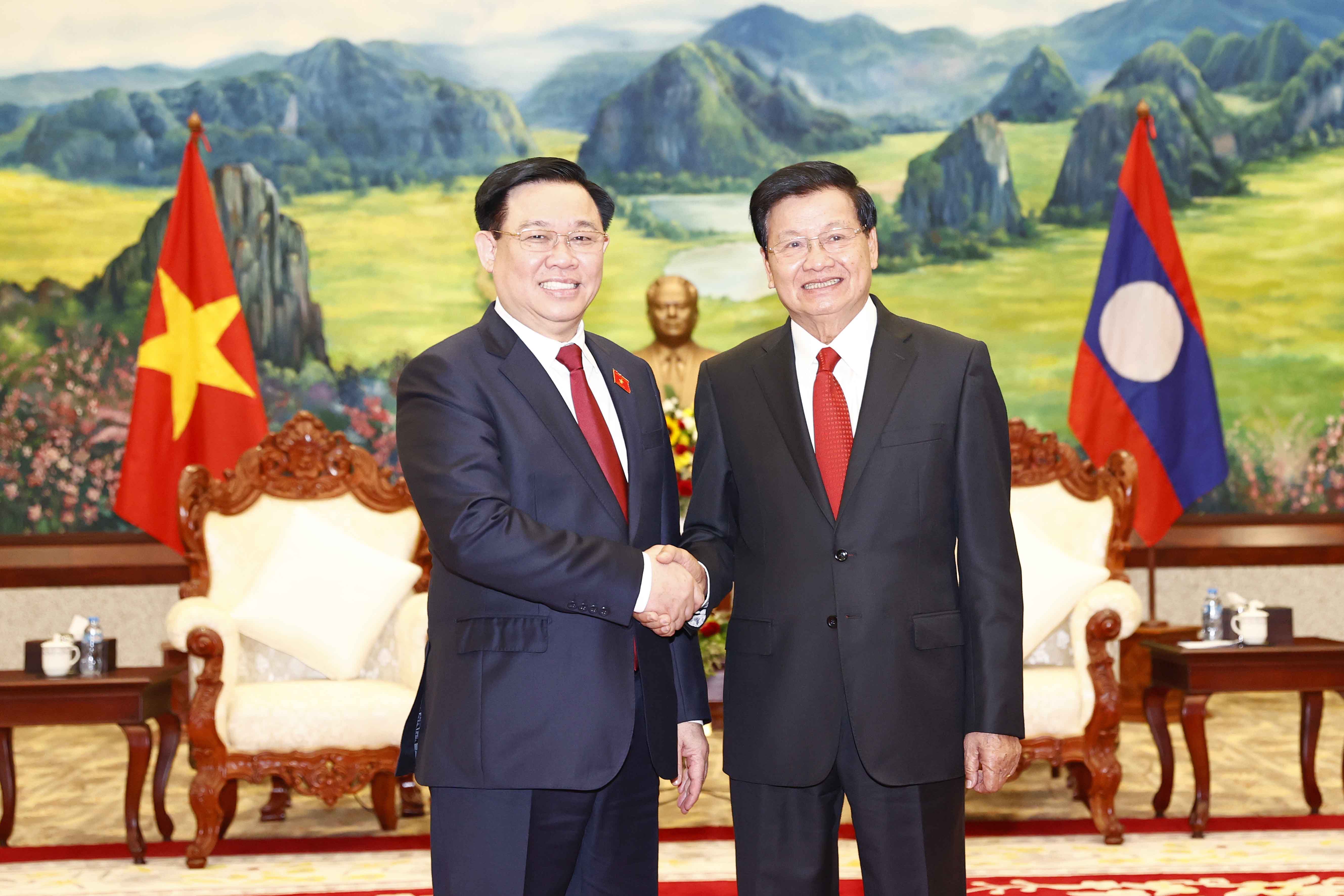 Tổng Bí thư, Chủ tịch nước Lào Thongloun Sisoulith nhiệt liệt chào mừng Chủ tịch Quốc hội Vương Đình Huệ là Lãnh đạo chủ chốt đầu tiên của Việt Nam thăm chính thức Lào trong “Năm Đoàn kết Hữu nghị Việt Nam - Lào, Lào - Việt Nam 2022”; nhấn mạnh chuyến thăm mang nhiều ý nghĩa này sẽ góp phần thắt chặt hơn nữa quan hệ gắn bó keo sơn, thủy chung trong sáng, đoàn kết đặc biệt giữa hai nước; bày tỏ vui mừng về những thành tựu to lớn và toàn diện mà nhân dân Việt Nam anh em, dưới sự lãnh đạo sáng suốt của Đảng Cộng sản Việt Nam, đã giành được thời gian qua, đặc biệt trong ứng phó với dịch COVID-19, mở cửa, phục hồi và phát triển kinh tế - xã hội, tiếp tục hội nhập quốc tế sâu rộng, trong đó có đóng góp vô cùng quan trọng của Quốc hội Việt Nam trong vai trò cơ quan lập hiến, lập pháp và giám sát tối cao.