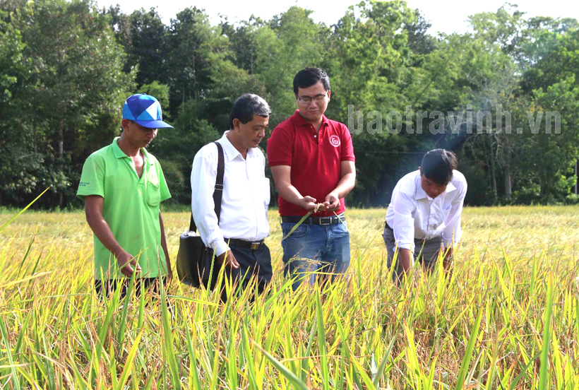 Chủ tịch Hội đồng quản trị kiêm Giám đốc HTX nông nghiệp Long Hiệp Trầm Minh Thuần (thứ 2 từ phải qua) cùng các xã viên, cán bộ xã Long Hiệp thăm ruộng lúa sắp thu hoạch.