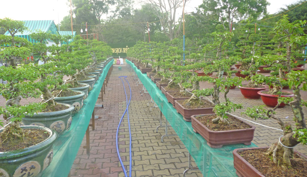 Đầu tiên là 2 hàng kiểng cổ “Tam cang ngũ thường” tạo hình đều tăm tắp. Vào bên trong là những tuyệt tác của các nghệ nhân trong và ngoài tỉnh.