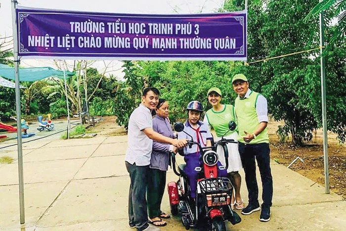 Thầy Mãi (bìa trái) trao xe điện vận động được cho học sinh khuyết tật.