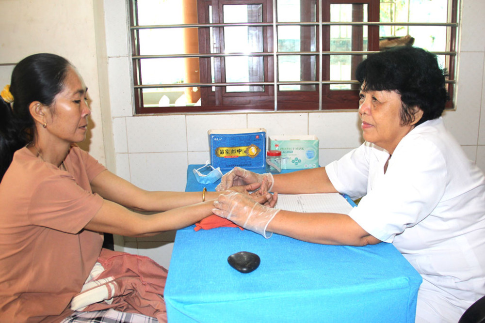 Lương y Trần Thị Yến (Phòng Chẩn trị y học cổ truyền Thanh Phú, ấp Phước Tú, xã Thanh Phú, huyện Bến Lức) bắt mạch cho bệnh nhân