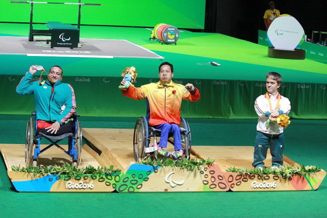 Lực sĩ khuyết tật Lê Văn Công (giữa) ghi dấu ấn trong năm thành công của thể thao VN với 1 HCV tại Paralympic. Ảnh tư liệu