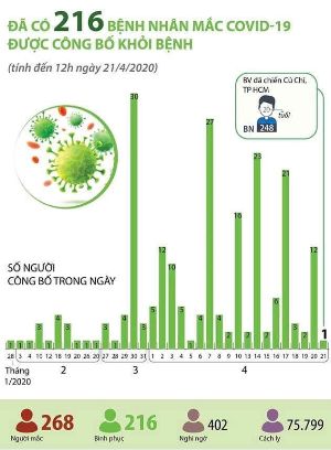 (ĐCSVN) - Ngày 21/4, thông tin từ tiểu Ban điều trị - Ban Chỉ đạo Quốc gia phòng, chống dịch COVID-19 cho biết, đã có 1 bệnh nhân mắc COVID-19 tại Bệnh viện dã chiến Củ Chi được công bố khỏi bệnh, đưa tổng số bệnh nhân khỏi bệnh COVID-19 đến nay là 216 người.