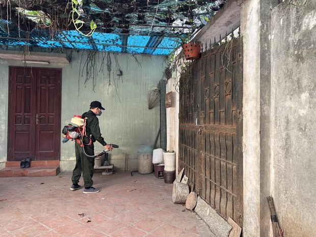 Phun thuốc diệt muỗi để phòng bệnh sốt xuất huyết. (Ảnh: PV/Vietnam+)
