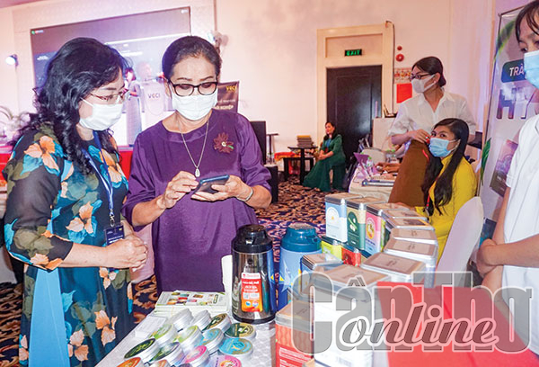 Tiếp cận nguồn vốn ưu đãi phục vụ sản xuất, kinh doanh là mong muốn của nhiều DNVVV do phụ nữ làm chủ. Trong ảnh: Bà Ðoàn Thị Hồng Thắm (bìa trái), Giám đốc Công ty TNHH MTV Hygie & Panacee quảng bá sản phẩm tại một sự kiện.