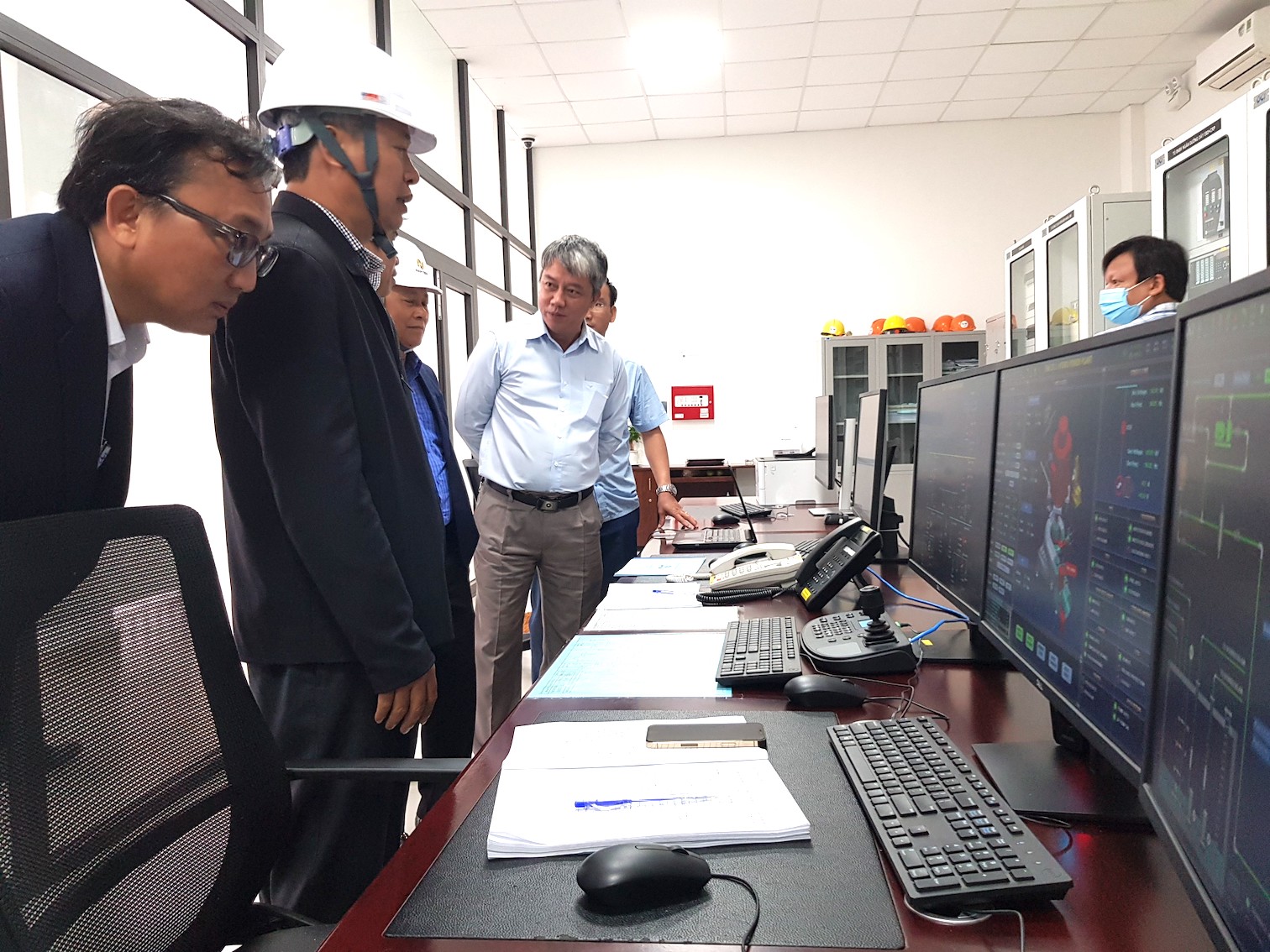 | Các đại biểu tham quan khu điều hành đường dây và TBA 110KV dùng chung đấu nối cụm thủy điện Nam Trà My. |