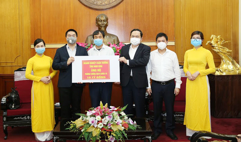 | Chủ tịch Uỷ ban Trung ương MTTQ Việt Nam Trần Thanh Mẫn tiếp nhận ủng hộ từ doanh nghiệp Xuân Trường. |