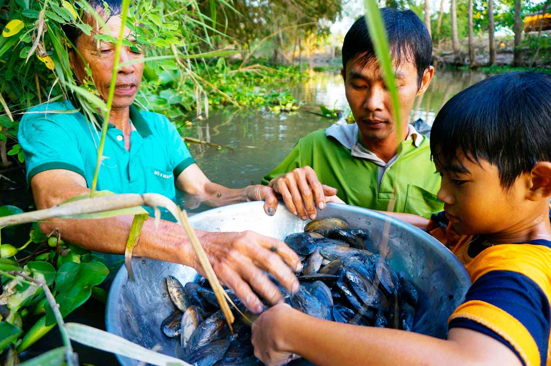 Sau một hồi lặn, ngụp, ông Mười, thằng con trai và đứa cháu thu được thau chiến lợi phẩm