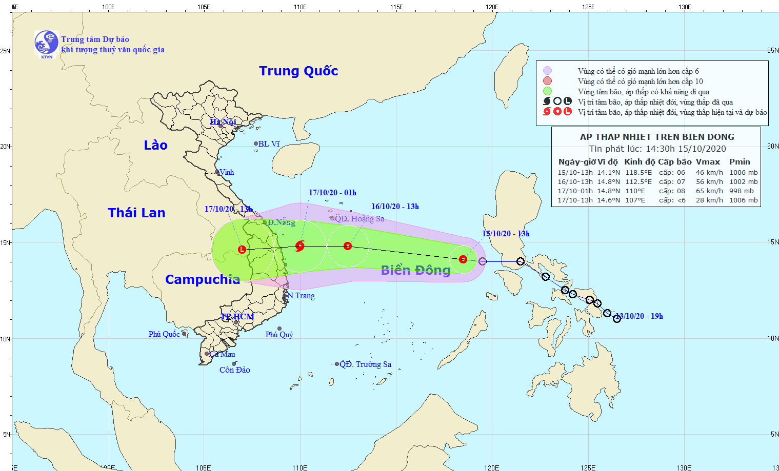 Theo bản tin của Trung tâm Dự báo Khí tượng thủy văn Quốc gia, một áp thấp nhiệt đới (ATNĐ) đang hoạt động trên biển Đông. Hồi 13h00 ngày 15/10, vị trí tâm ATNĐ ở vào khoảng 14,1 độ Vĩ Bắc; 118,5 độ Kinh Đông, sức gió mạnh nhất vùng gần tâm ATNĐ mạnh cấp 6, giật cấp 8. Dự báo trong 24 giờ tới, ATNĐ di chuyển nhanh theo hướng Tây Tây Bắc, mỗi giờ đi được khoảng 25km; trong 24-36 giờ tiếp theo, ATNĐ di chuyển theo hướng Tây, mỗi giờ đi được 20-25km và có khả năng mạnh lên thành bão.