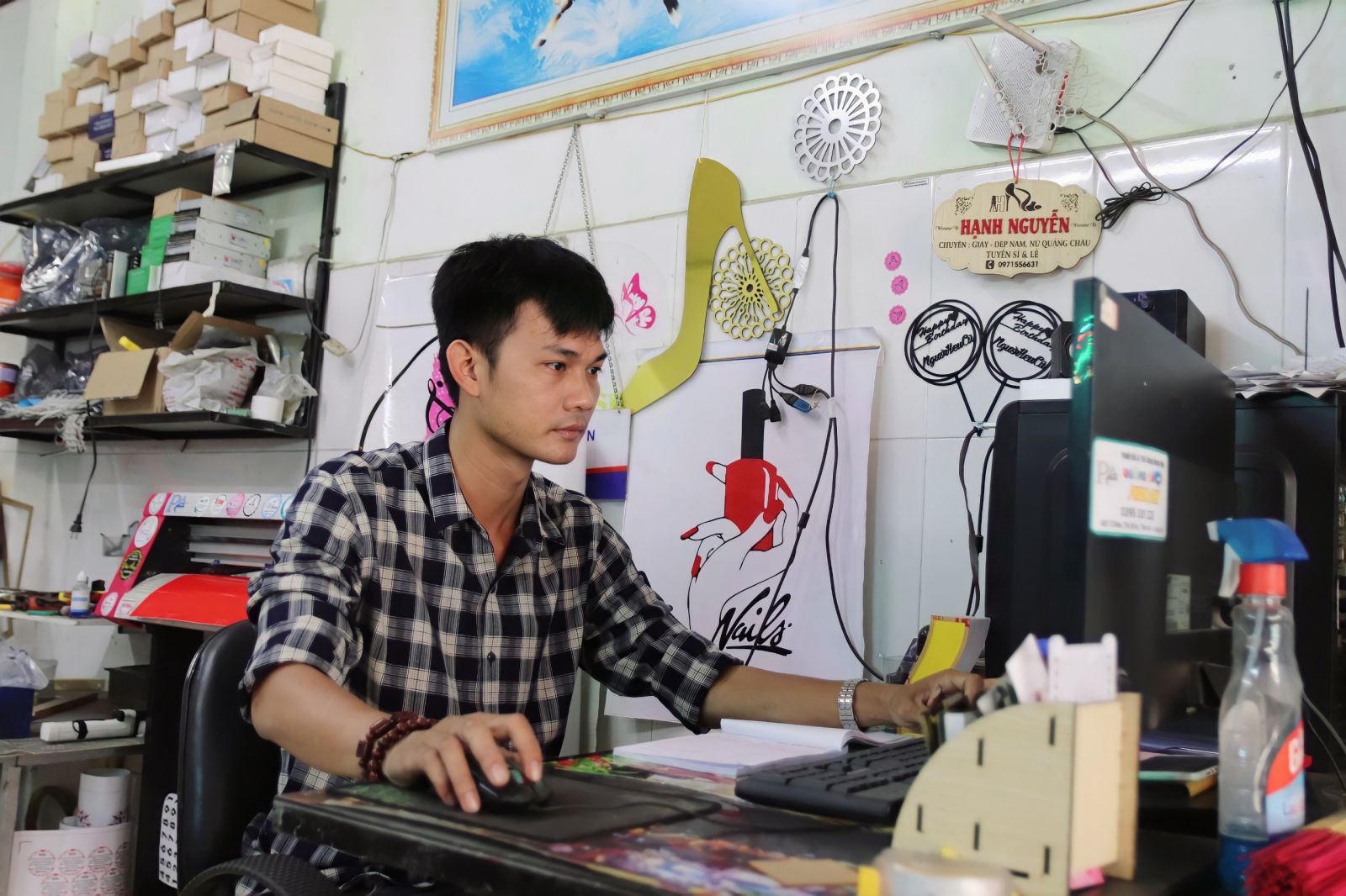Cơ sở nhỏ không có từng bộ phận chuyên môn nên Phan Anh kiêm hết tất cả công đoạn từ thiết kế đến lắp đặt bảng quảng cáo cho khách. Được biết, trước đây, ngoài giờ đi làm, Phan Anh lên Youtube tìm tòi, học hỏi các phần mềm ứng dụng trong lĩnh vực quảng cáo như: Adobe Illustrator, Photoshop, Corel, 3D,...