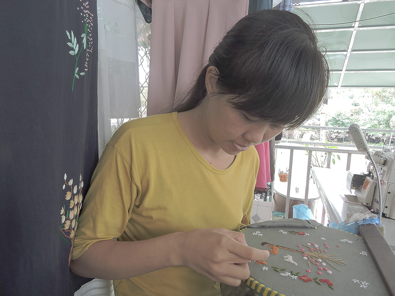 Hồng Nhi bên các sản phẩm thêu tay theo yêu cầu của khách. Ảnh: MỸ TÚ