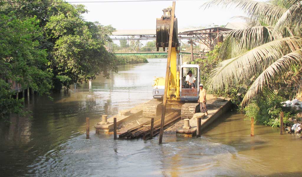 Thi công đắp đập ngăn mặn ở đoạn kênh gần cầu Bà Hai Màng vào chiều 7-4
