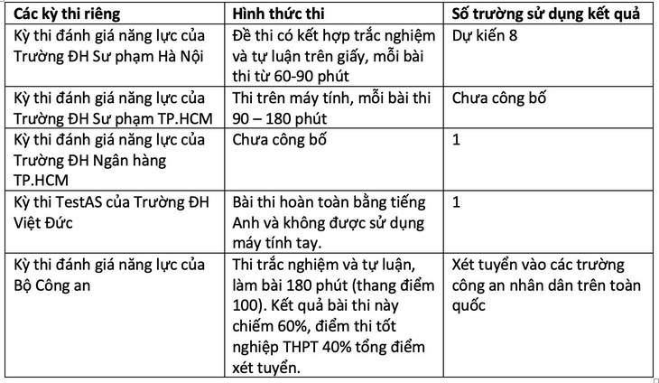 Tám đơn vị tổ chức kỳ thi riêng để tuyển sinh năm nay gồm: Đại học Quốc gia TP.HCM, Đại học Quốc gia Hà Nội, Đại học Bách khoa Hà Nội, Trường đại học học Sư phạm Hà Nội, Trường đại học Sư phạm TP.HCM, Trường đại học Ngân hàng TP.HCM, Trường đại học Việt Đức và Bộ Công an.
