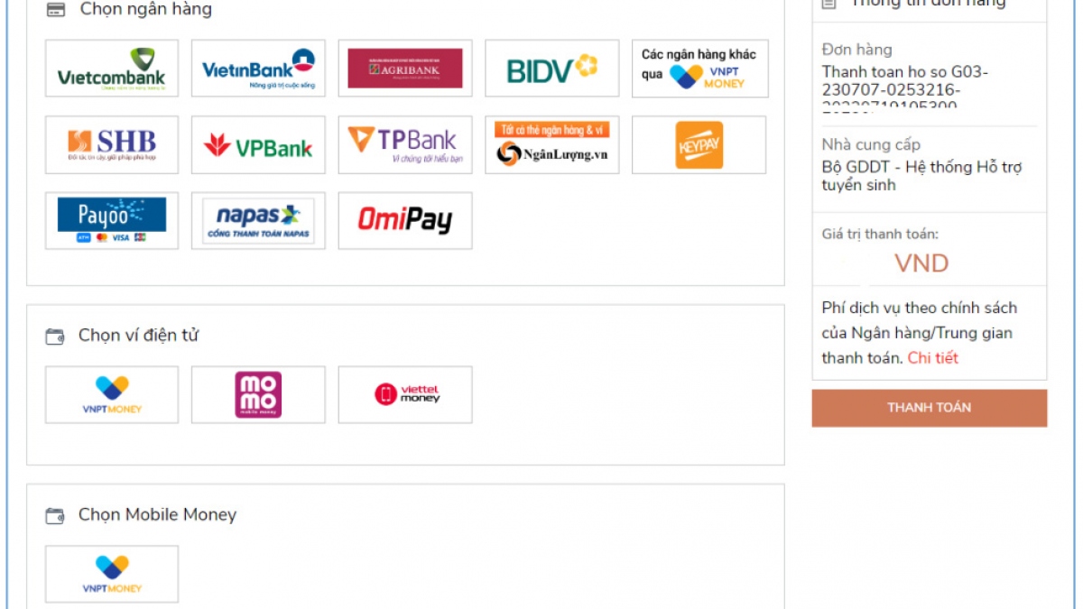 Các kênh thanh toán lệ phí đăng ký xét tuyển đại học