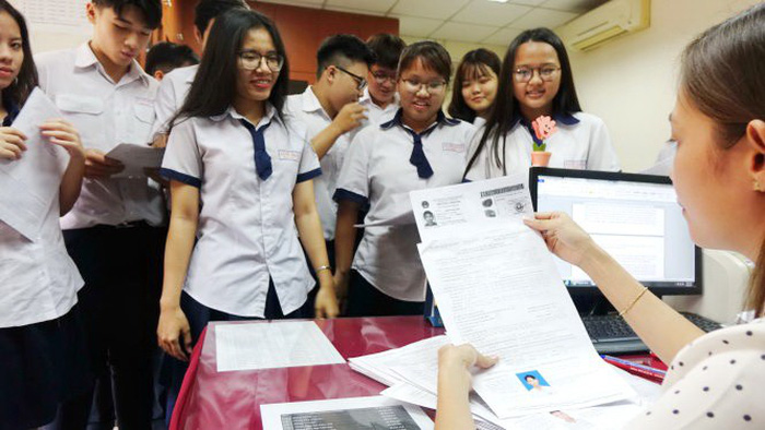 Học sinh Trường THPT Nguyễn Thái Bình, TP.HCM đăng ký dự thi THPT quốc gia 2018 - Ảnh: Như Hùng