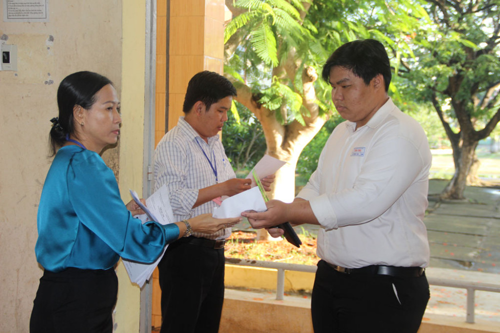 Cán bộ coi thi kiểm tra giấy tờ các thí sinh trước khi vào phòng thi