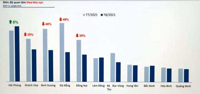 Thống kê của batdongsan.com.vn chỉ rõ, trong tháng 8/2021, lượng tin đăng toàn trang về bất động sản trong tháng 8/2021 giảm 58%, lượt quan tâm giảm 27% so với tháng 7/2021. Mức giảm mạnh nhất tại các tỉnh, thành phố có có ca nhiễm tăng cao như TP.HCM, Bình Dương, Đồng Nai, Đà Nẵng, Khánh Hòa, Hà Nội.