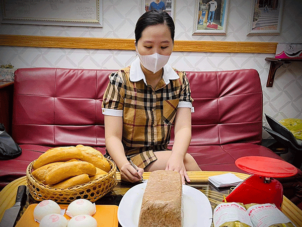 Chị Trần Như Ngọc (lò bánh mì Hữu Hiệp) soạn đơn hàng cho khách online. Ảnh: CTV