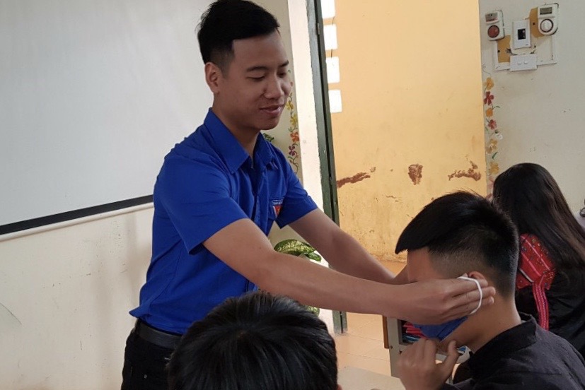 | Đoàn viên, thanh niên hướng dẫn các em nhỏ đeo khẩu trang đúng cách |