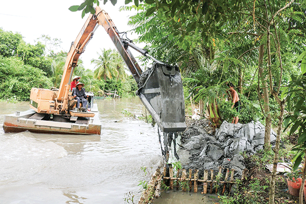 Người dân ở xã Trường Xuân B chủ động thực hiện gia cố bờ sông để tránh bị sạt lở trong mùa mưa lũ 2019.