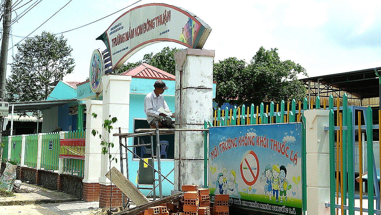 Cái nắng gay gắt những ngày đầu tháng 8 không làm giáo viên Trường Mầm non (MN) Đông Thuận nản lòng. Các cô chăm chú sửa sang lại phòng học, tạo góc sân chơi, trồng thêm cây xanh… tạo cảnh quan môi trường sư phạm, đồng thời giúp trường đủ điều kiện tái công nhận trường chuẩn quốc gia vào tháng 8-2017. Lau mồ hôi trên trán, cô Huỳnh Thị Lệ Thu, giáo viên dạy lớp Lá của trường, vui vẻ: “Hơn 20 năm gắn bó với nghề, tôi rất hiểu sự thiếu thốn của học sinh vùng ngoại thành. Càng yêu trẻ, tôi càng yêu mái nhà chung này, nên tranh thủ thời gian rảnh rỗi, chúng tôi đều đến trường dọn dẹp, trang trí phòng học để trẻ đến trường cảm thấy mỗi ngày thực sự là một niềm vui. Mỗi giáo viên chúng tôi còn học tập, rèn luyện, đáp ứng yêu dạy học, chăm sóc trẻ”. Công tác tại trường từ năm 2007, thời điểm trường còn nhiều khó khăn, phòng ốc xuống cấp, đồ dùng dạy học, đồ chơi cho trẻ thiếu thốn, cô Thu và những giáo viên khác vẫn nỗ lực bám trường, bám lớp. Nay, cơ sở vật chất, trường lớp khang trang, các cô càng phấn đấu giảng dạy tốt hơn.