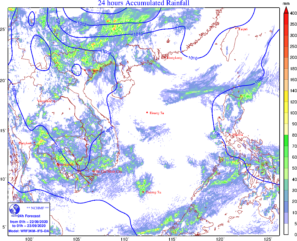 Dự báo: Do ảnh hưởng của rãnh áp thấp bị nén bởi áp cao lục địa ở phía Bắc kết hợp với hội tụ gió trên mực 1500 mét nên từ đêm nay (22/9) đến ngày 24/9 ở Bắc Bộ có mưa vừa, mưa to, có nơi mưa rất to và rải rác có dông với lượng mưa phổ biến 50-100mm/24h; riêng các tỉnh Lào Cai, Yên Bái, Hà Giang, Tuyên Quang, Cao Bằng, Bắc Cạn, Lạng Sơn, Thái Nguyên có nơi trên 150mm/24h. Ngày mai (23/9), các tỉnh Thanh Hóa và phía Bắc Nghệ An có mưa, có nơi mưa vừa, mưa to và rải rác có dông. Trong mưa dông có khả năng xảy ra lốc, sét, mưa đá và gió giật mạnh.