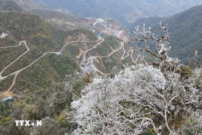 Băng giá xuất hiện từ đêm 26/1 tại các đỉnh Trống Páo Sang, Khau Phạ và Kháu Nha thuộc xã La Pán Tẩn; đỉnh Lùng Cúng thuộc xã Nậm Có, huyện Mù Cang Chải (Yên Bái). (Ảnh: TTXVN phát)
