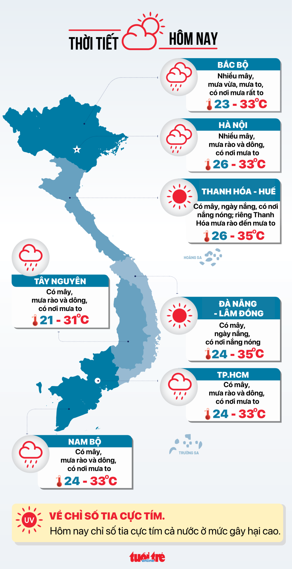 Phía Tây Bắc Bộ: Nhiều mây, mưa vừa, mưa to và rải rác có dông, cục bộ có nơi mưa rất to. Gió nhẹ. Trong mưa dông khả năng có lốc, sét, mưa đá và gió giật mạnh. Nhiệt độ thấp nhất 24-27 độ C, có nơi dưới 23 độ C; cao nhất 30-33 độ C.
