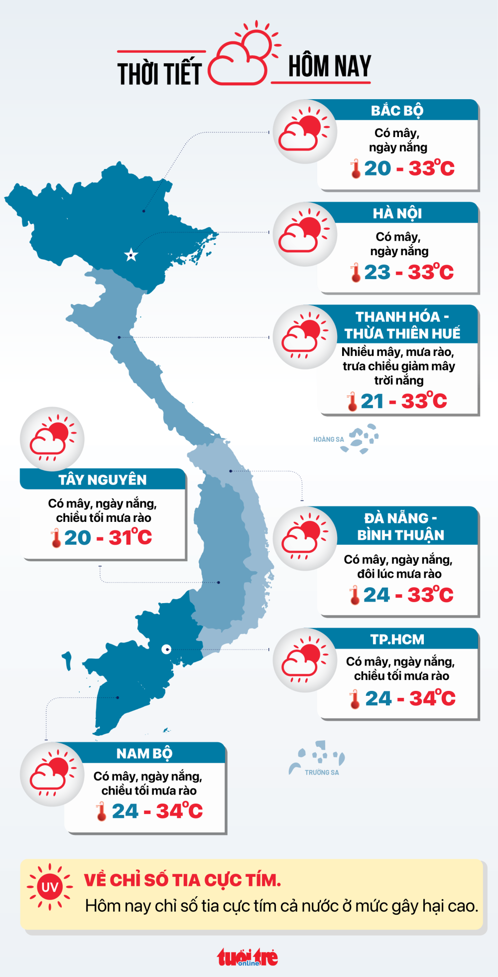 Hà Nội có mây, ngày nắng. Nhiệt độ thấp nhất 23-25 độ C, cao nhất 31-33 độ C.