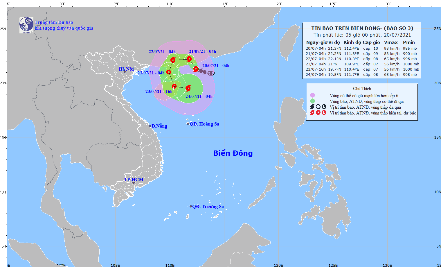 Dự báo trong 24 giờ tới, bão di chuyển theo hướng Tây Bắc, mỗi giờ đi được khoảng 5km. Đến 04 giờ ngày 21/7, vị trí tâm bão ở khoảng 22,2 độ Vĩ Bắc; 111,8 độ Kinh Đông, trên đất liền phía Tây Nam tỉnh Quảng Đông (Trung Quốc). Sức gió mạnh nhất vùng gần tâm bão mạnh cấp 9 (75-90km/giờ), giật cấp 11.