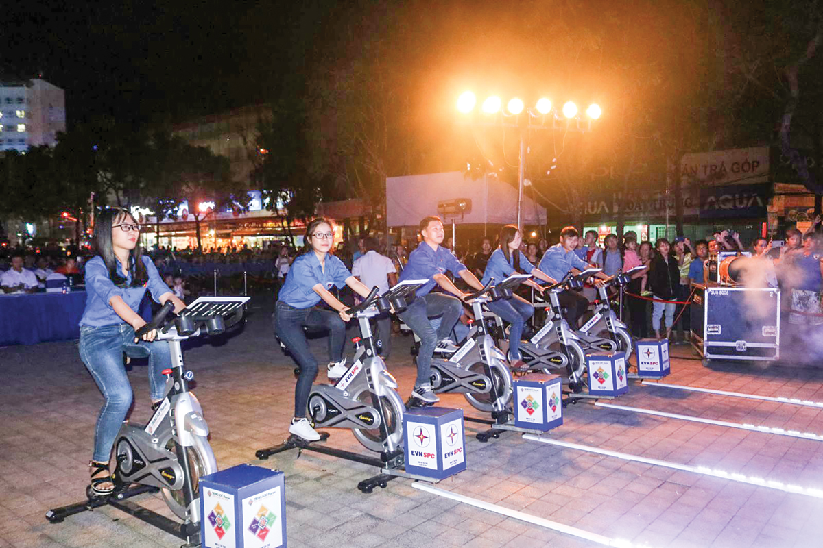 Đoàn viên thanh niên tham gia đạp xe tạo năng lượng điện chiếu sáng thắp sáng tại lễ phát động Chiến dịch “Giờ Trái đất” tại Công viên Lưu Hữu Phước.