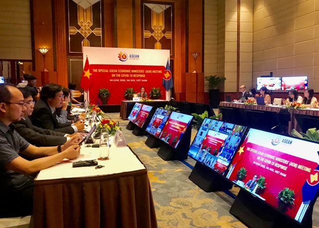 Sáng 4/6, các Bộ trưởng Kinh tế thuộc Hiệp hội các quốc gia Đông Nam Á (ASEAN) tổ chức họp theo hình thức trực tuyến nhằm triển khai những chỉ đạo mà các Nhà Lãnh đạo ASEAN đã đưa ra tại Hội nghị Cấp cao ASEAN đặc biệt về ứng phó với dịch COVID-19 vào ngày 14/4/2020.
