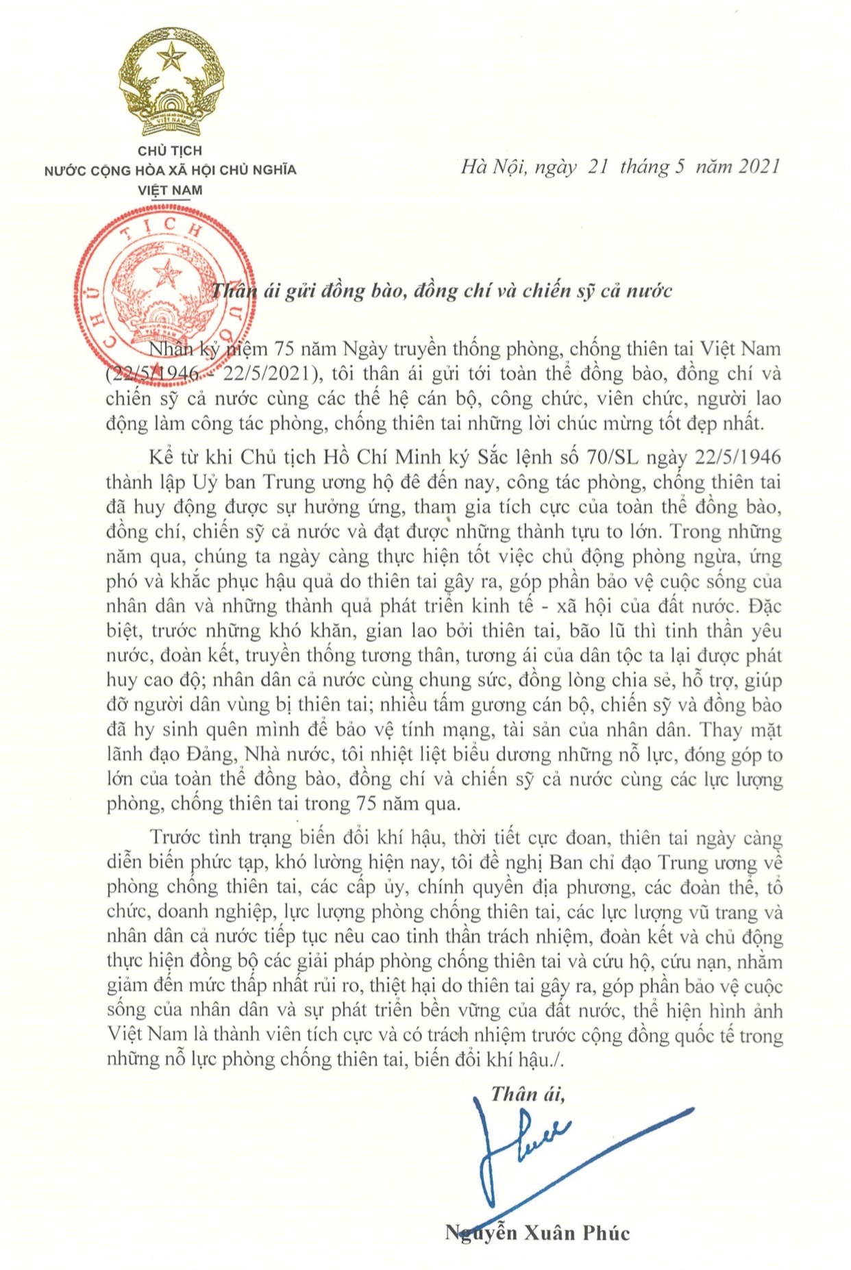 "Nhân kỷ niệm 75 năm Ngày truyền thống phòng, chống thiên tai Việt Nam (22/5/1946-22/5/2021), tôi thân ái gửi tới toàn thể đồng bào, đồng chí và chiến sỹ cả nước cùng các thế hệ cán bộ, công chức, viên chức, người lao động làm công tác phòng, chống thiên tai những lời chúc mừng tốt đẹp nhất.