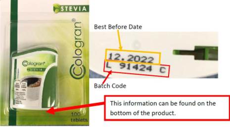 Theo đó, sản phẩm Cologran Stevia sweetener tables bị cảnh báo và thu hồi có quy cách bao gói: 100 gói; số lô: L91424C; Hạn sử dụng trước ngày cuối cùng tháng 12/2022.