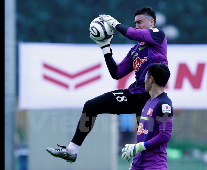Văn Lâm không có nhiều hy vọng bắt chính khi đối thủ là Nguyên Mạnh và Minh Long. (Ảnh: Vi Khánh/Vietnam+)