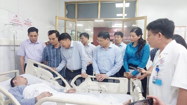 | Lực lượng chức năng thăm hỏi nạn nhân bị thương trong sự cố cháy khí metan tại hầm lò của Công ty Than Thống Nhất – TKV. Ảnh: TTXVN. |