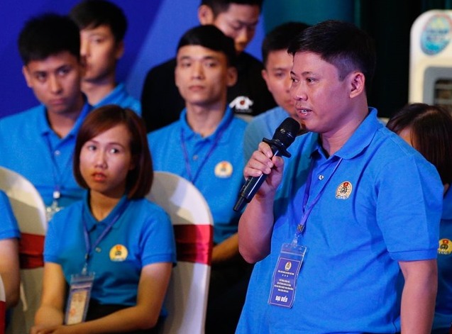 Công nhân đặt câu hỏi tại buổi đối thoại giữa Thủ tướng Chính phủ với 1.000 công nhân đang làm việc tại các khu công nghiệp vùng Đồng bằng sông Hồng. Ảnh: Minh Châu