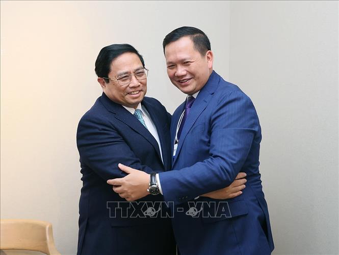 | Thủ tướng Phạm Minh Chính gặp Thủ tướng Campuchia Hun Manet. (Ảnh: Dương Giang/TTXVN) |