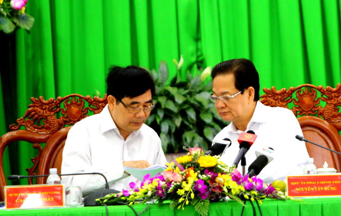 Thủ tướng Nguyễn Tấn Dũng trao đổi với Bộ trưởng Bộ Nông nghiệp và phát triển nông thôn Cao Đức Phát tại cuộc họp về phòng, chống xâm nhập mặn với lãnh đạo 13 tỉnh, thành ĐBSCL - Ảnh: Chí Quốc