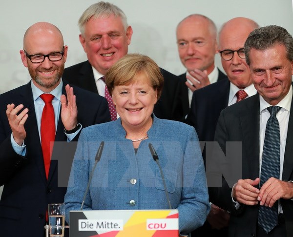 Thủ tướng Đức Angela Merkel (giữa) tại trụ sở đảng CDU ở Berlin ngày 24/9. (Nguồn: THX/TTXVN)
