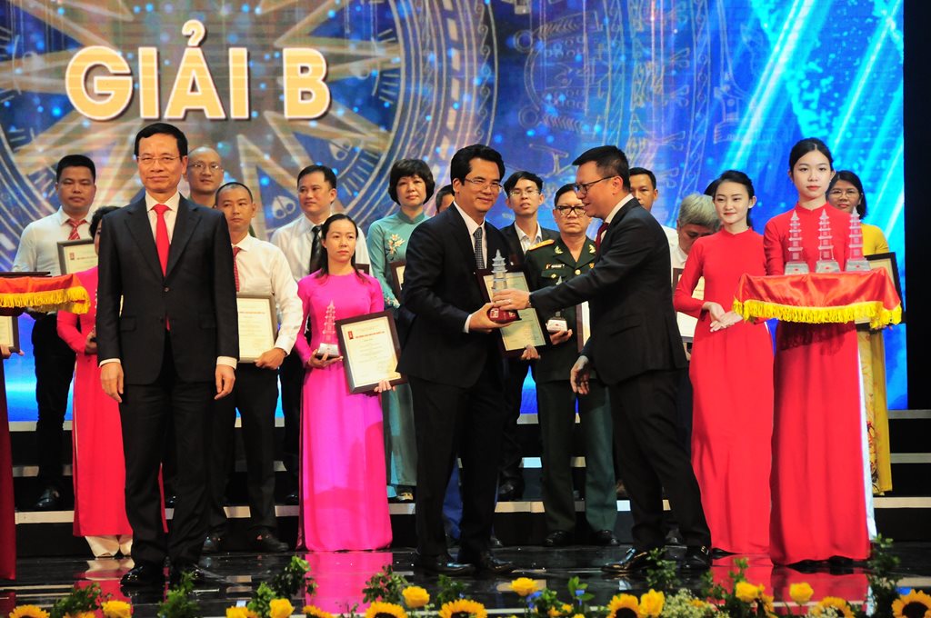 | Chủ tịch Hội Nhà báo Việt Nam Lê Quốc Minh và Bộ trưởng Bộ Thông tin và Truyền thông Nguyễn Mạnh Hùng trao giải B cho các tác giả, nhóm tác giả. (Ảnh: Thế Dương) |