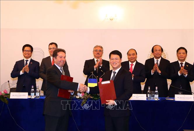 Thủ tướng Nguyễn Xuân Phúc và ông Viorel Stefan, Phó Thủ tướng Romania chứng kiến Lễ ký kết và trao các văn bản hợp tác giữa hai nước tại Diễn đàn. (Ảnh: Thống Nhất/TTXVN)