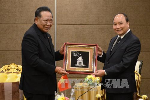 Thủ tướng Nguyễn Xuân Phúc tặng quà lưu niệm cho Chủ tịch Hội hữu nghị Thái Lan - Việt Nam Prachuab Chaiyasan. Ảnh: Sơn Nam -TTXVN tại Bangkok