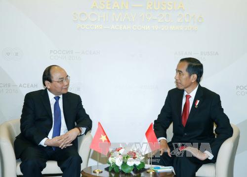 Tại cuộc gặp Tổng thống Indonesia Joko Widodo, hai bên vui mừng nhận thấy quan hệ đối tác chiến lược Việt Nam – Indonesia đang phát triển tốt đẹp trên mọi lĩnh vực và nhấn mạnh trong thời gian tới, hai bên cần tiếp tục thúc đẩy trao đổi đoàn các cấp, tăng cường hợp tác an ninh, quốc phòng; tìm cách tháo gỡ khó khăn để tăng kim ngạch song phương, phấn đấu đạt mục tiêu 18 tỷ USD vào năm 2018; đẩy mạnh đàm phán phân định vùng đặc quyền kinh tế. Về các vấn đề khu vực, hai nhà lãnh đạo nhấn mạnh, cần tăng cường đoàn kết và duy trì vai trò trung tâm của ASEAN trong các vấn đề lớn liên quan đến an ninh, lợi ích của mỗi nước và của khu vực. Hai nhà lãnh đạo cũng khẳng định tầm quan trọng của việc bảo đảm hòa bình, ổn định, an ninh, an toàn, tự do hàng hải, hàng không ở Biển Đông, thực hiện Tuyên bố về ứng xử của các bên ở Biển Đông (DOC) và sớm ký kết Bộ quy tắc ứng xử (COC) cũng như giải quyết các tranh chấp trên biển dựa trên luật pháp quốc tế, trong đó có Công ước Liên hợp quốc về Luật biển 1982.