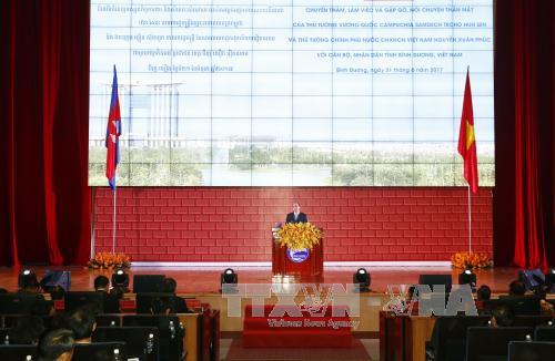 Phát biểu tại buổi gặp mặt, Thủ tướng Samdech Techo Hun Sen trân trọng gửi lời cảm ơn Thủ tướng Nguyễn Xuân Phúc và Chính phủ Việt Nam, chính quyền và nhân dân các tỉnh Bình Dương, Bình Phước đã dành cho cá nhân Thủ tướng Hun Sen và Đoàn sự đón tiếp chân thành, trọng thị.