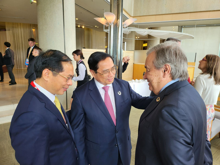 Thủ tướng Phạm Minh Chính trao đổi với Tổng thư ký Liên Hiệp Quốc Antonio Guterres trước phiên thảo luận đầu tiên - Ảnh: Bộ Ngoại giao cung cấp