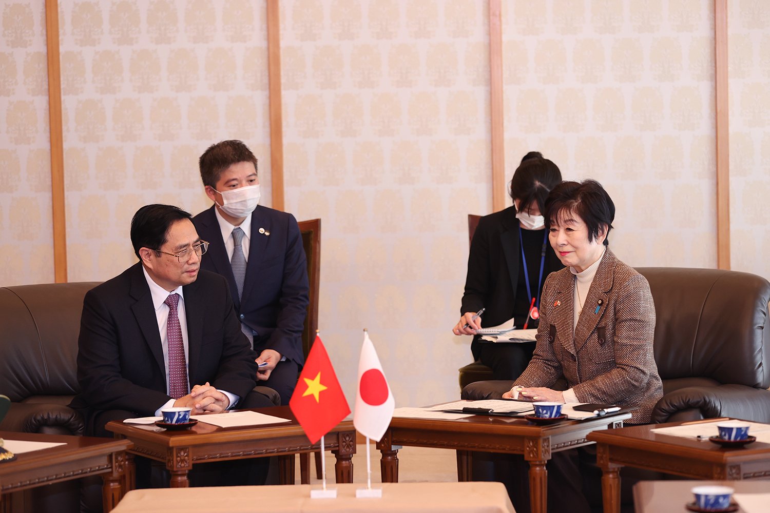 Thủ tướng Chính phủ Phạm Minh Chính đề nghị tăng cường hợp tác giữa cơ quan lập pháp hai nước; thúc đẩy trao đổi thông tin, kinh nghiệm trong công tác lập pháp; phát huy vai trò cầu nối của các tổ chức Nghị sĩ hữu nghị hai nước; tăng cường phối hợp, hợp tác giữa Quốc hội Việt Nam và Quốc hội Nhật Bản tại các diễn đàn liên nghị viện khu vực và thế giới. Thủ tướng Phạm Minh Chính mong muốn Thượng viện Nhật Bản ủng hộ các kế hoạch hợp tác lớn giữa hai nước, quan tâm thúc đẩy hợp tác trong lĩnh vực kinh tế - thương mại, lao động, giao lưu nhân dân, giao lưu giữa địa phương hai nước.