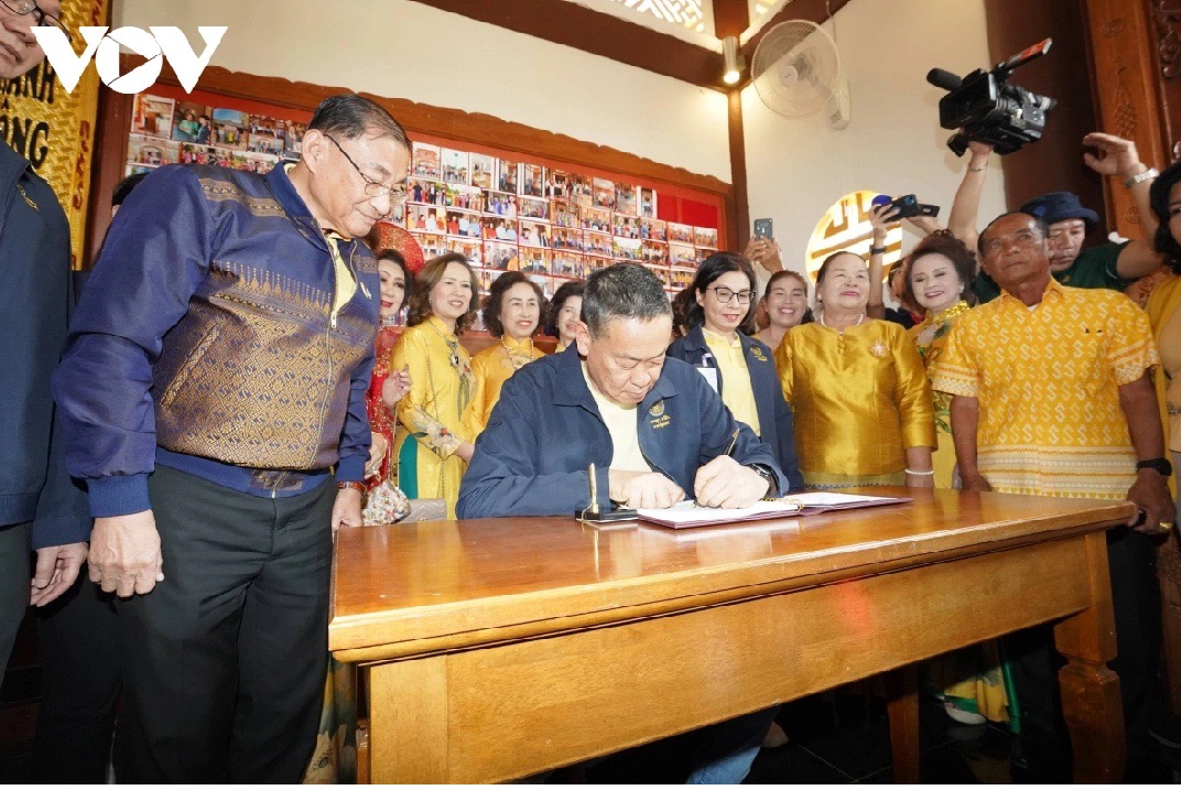 | Thủ tướng Thái Lan Srettha Thavisin viết sổ lưu niệm tại Khu tưởng niệm Chủ tịch Hồ Chí Minh tại tỉnh Nakhon Phanom sáng 17/2. (Ảnh: vov.vn) |