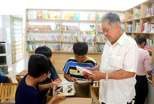 Ông Ba Tấn cùng các độc giả nhí phân loại sách của nhà hảo tâm gửi tặng thư viện.