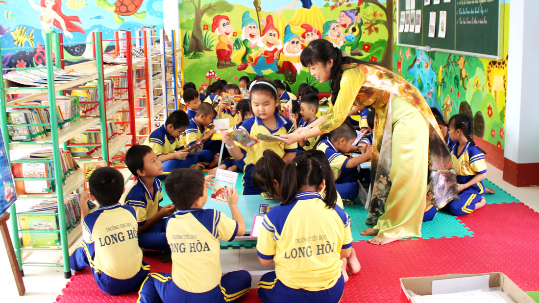 Ngoài các góc trò chơi phát triển ngôn ngữ, góc tra cứu, góc sáng tạo, sách được trưng bày trên kệ, được dán mã màu phân loại theo trình độ đọc; kệ sách cũng được thiết kế phù hợp với chiều cao của học sinh và có mã màu tương ứng giúp các em dễ tiếp cận. Ngoài việc đầu tư mua sách mới, trường còn vận động học sinh và phụ huynh tặng sách cho TV. Đến nay, TV Trường Tiểu học Long Hòa có trên 25.000 đầu sách các loại. Trường có hơn 1.400 học sinh, thế nên ban giám hiệu xếp thời khóa biểu và quy định ngày, giờ vào TV cụ thể đối với từng khối lớp. Các em học sinh lớp 4, lớp 5 ngoài việc tìm đọc những quyển sách hay còn tự phân công chia tổ, đọc sách cho các em lớp 1 nghe.